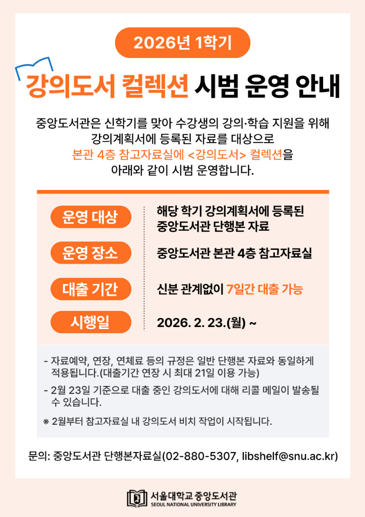 중앙도서관은 신학기를 맞아 수강생의 강의·학습 지원을 위해 아래와 같이 2026년 1학기 강의도서 컬렉션을 시범 운영합니다.